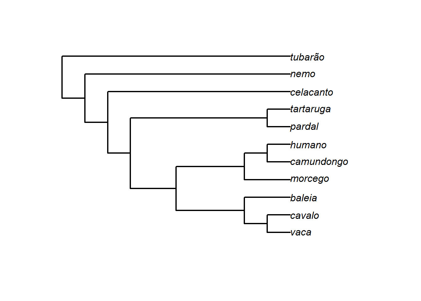 texto<-"(((((((vaca, cavalo),baleia),(morcego,(camundongo,humano))),(pardal,tartaruga)),celacanto),nemo),tubarão);"