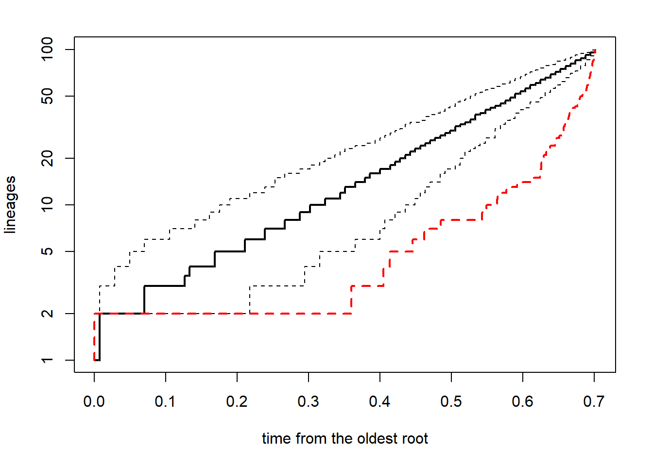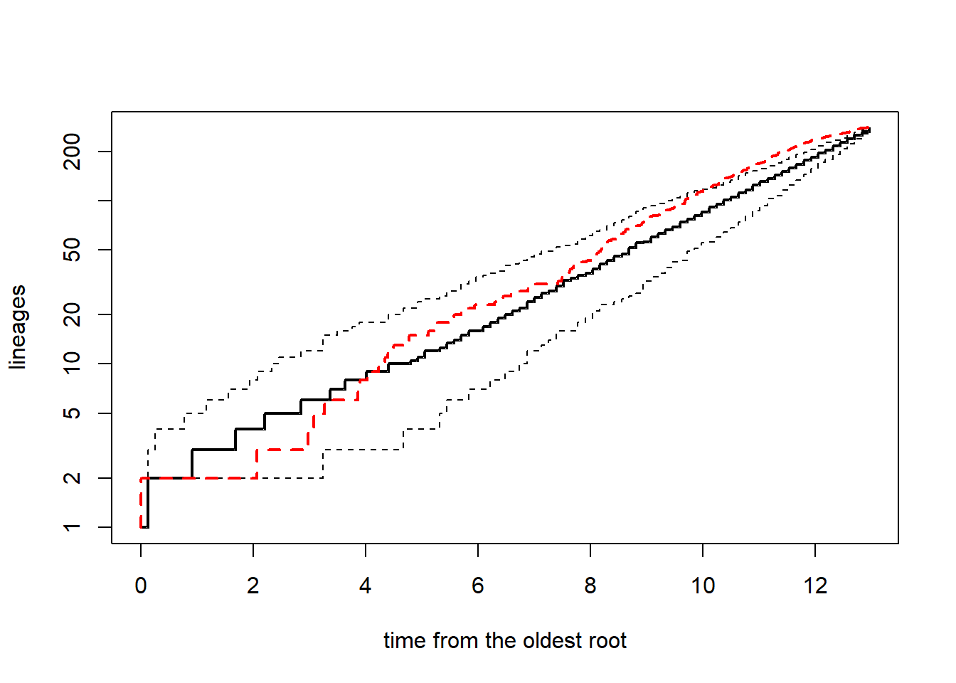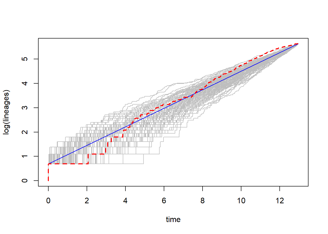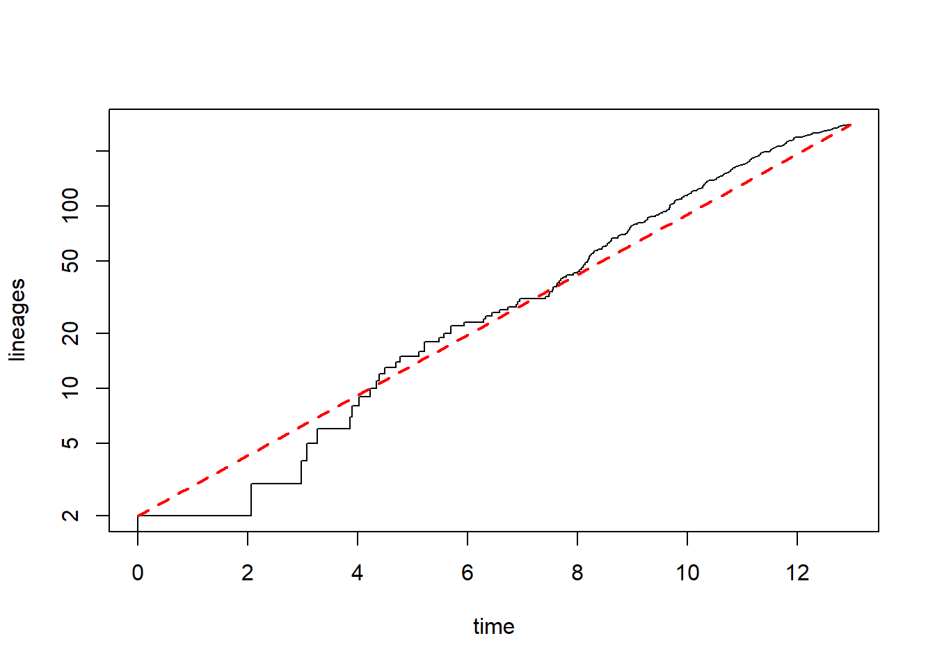 ltt(tree,add=TRUE,col="red",lty="dashed",lwd=2)}