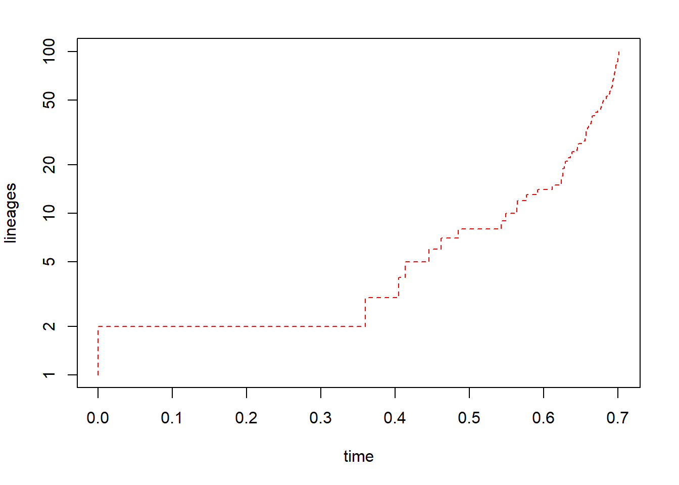 obj<-ltt(coal.tree,log.lineages=FALSE,log="y",col="red",lty="dashed")