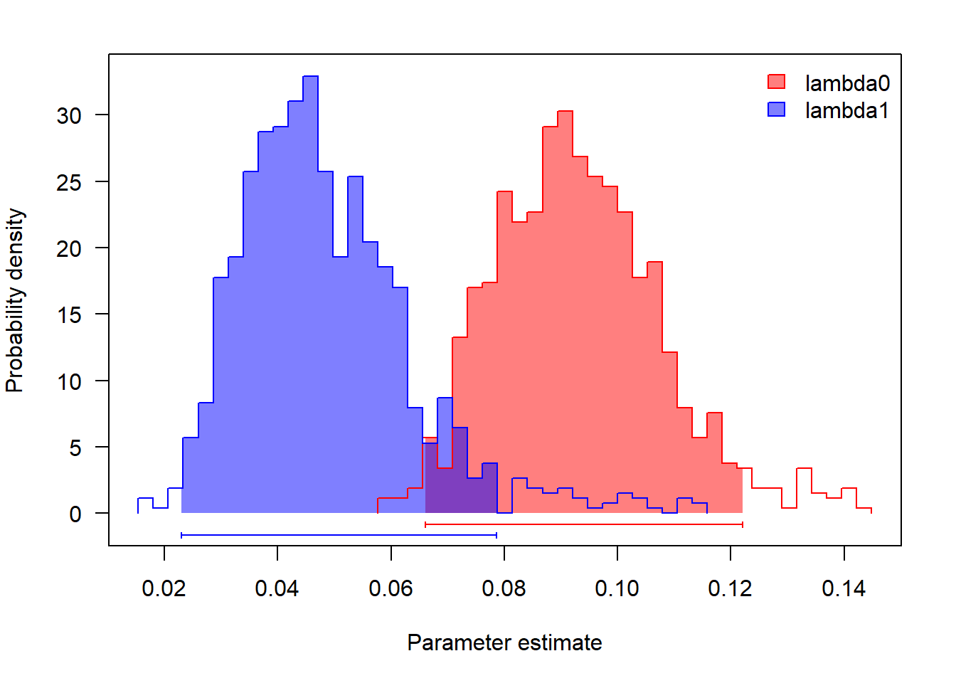 Assim como vimos no modelo bd simples, com o pacote diversitree podemos rodar análises bayesianas com os nossos modelos. Vamos fazer isso para o nosso melhor modelo para estimar os valores dos parâmetros.