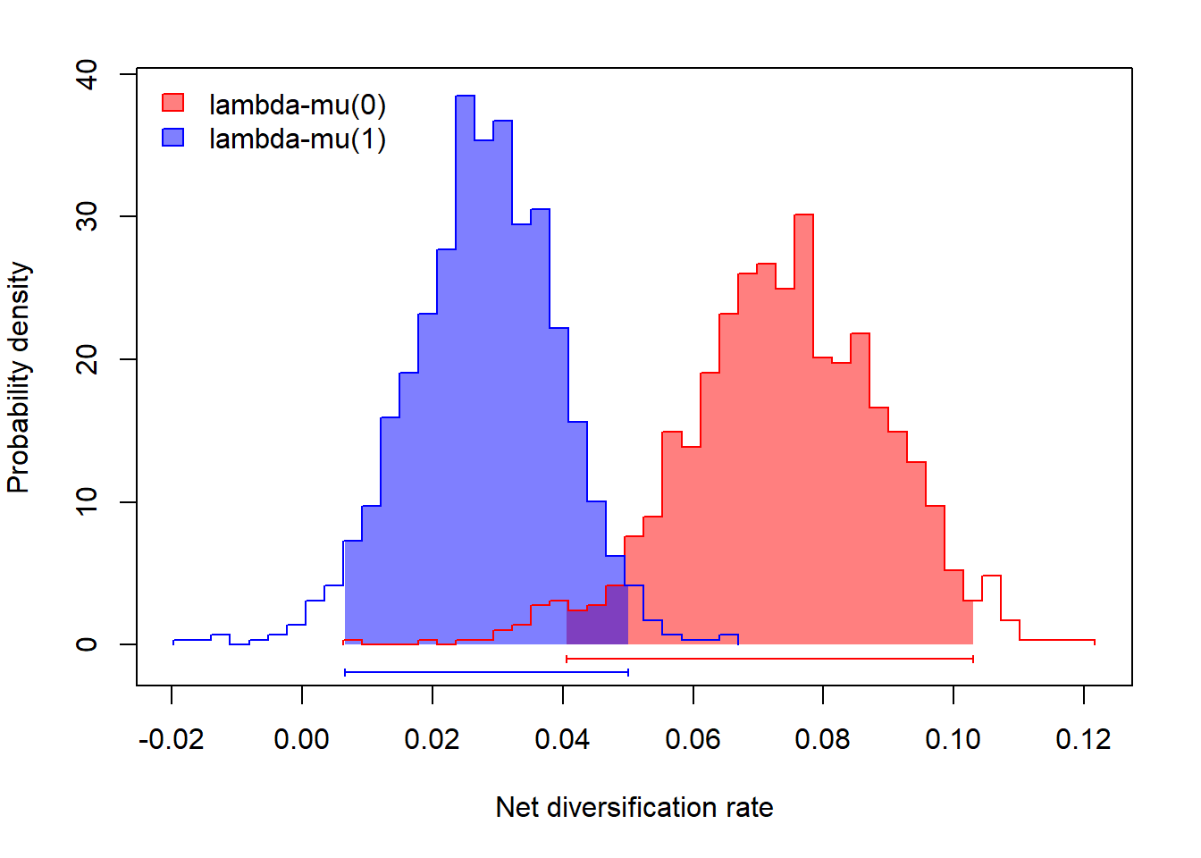coef(fit.lambda.mu)Parece que tanto as taxas de especiação como de extinção são maiores para o estado 0 (social) do que para o estado 1 (solitário). E a taxa de diversificação?