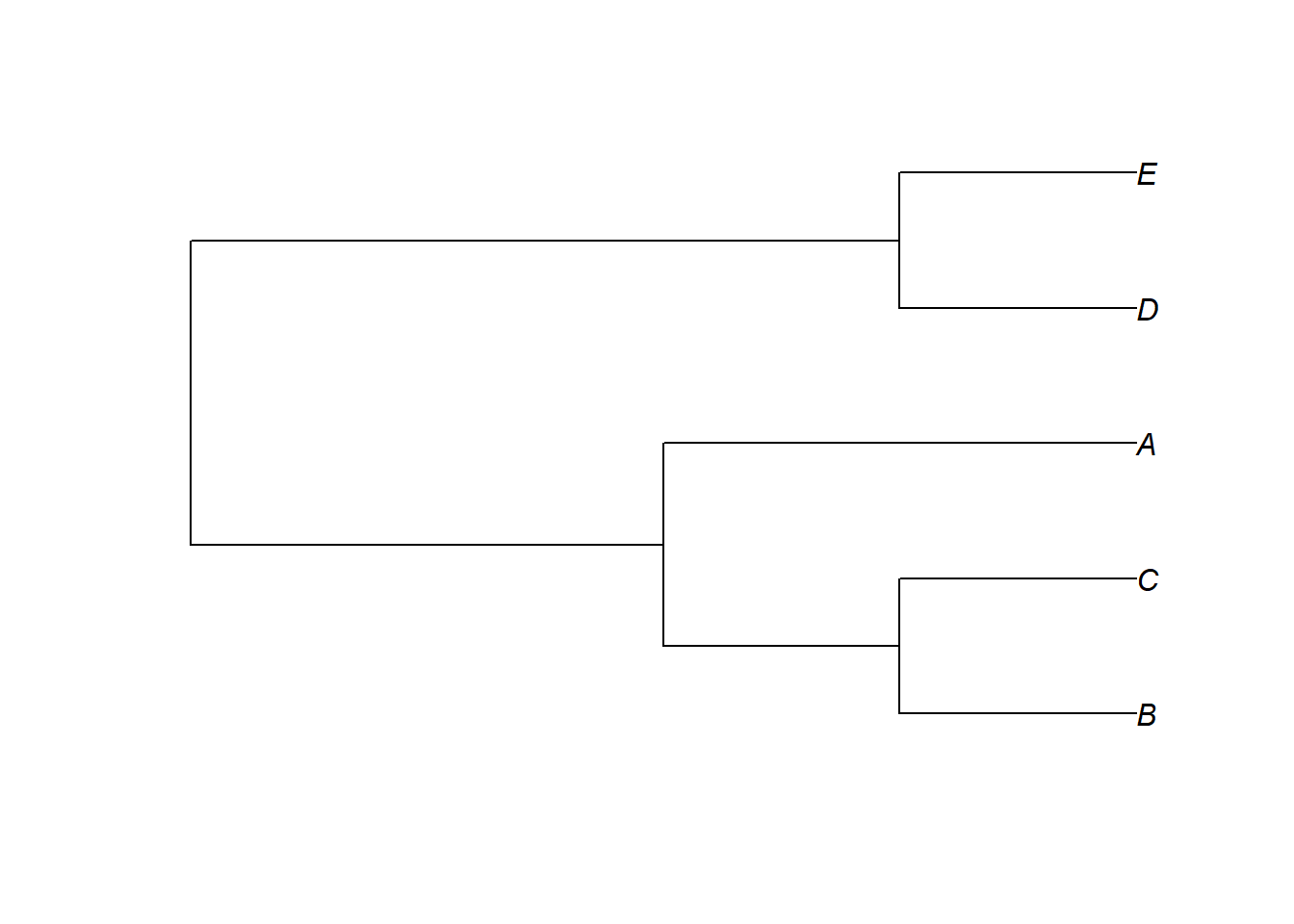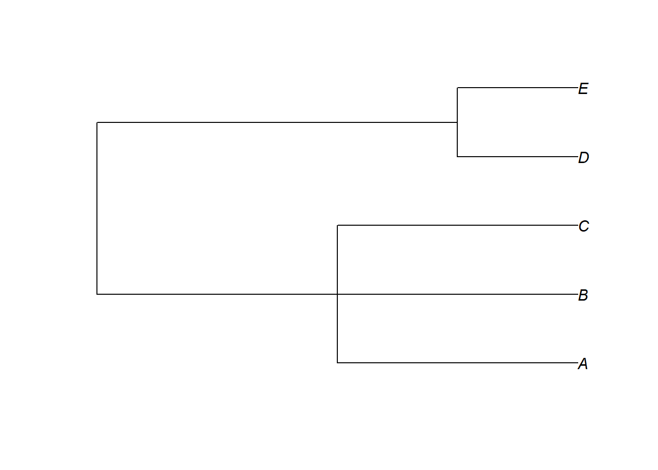 is.binary(ex1)Lembre-se que ao resolver apenas 1 vez ao acaso não existe avaliação de incerteza filogenética, é preciso repetir o processo um determinado número de vezes, que vai depender de quantas instâncias de politomia estiverem presentes na árvore, e quantas espécies estiverem nas politomias. Existem outros métodos que permitem gerar múltiplas árvores com as politomias resolvidas ao acaso. Por exemplo: sunplin- Rangel et al. (2015).