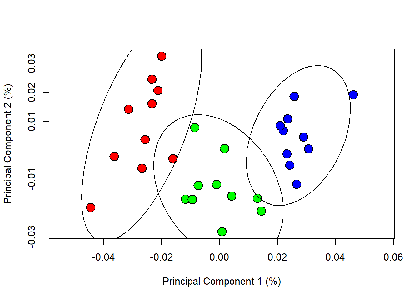 ordiellipse(PCA$x,group=species, kind="sd", conf=0.95)}