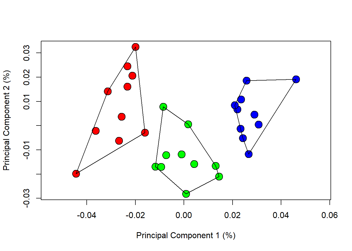 ordihull(PCA$x,group=species)}
