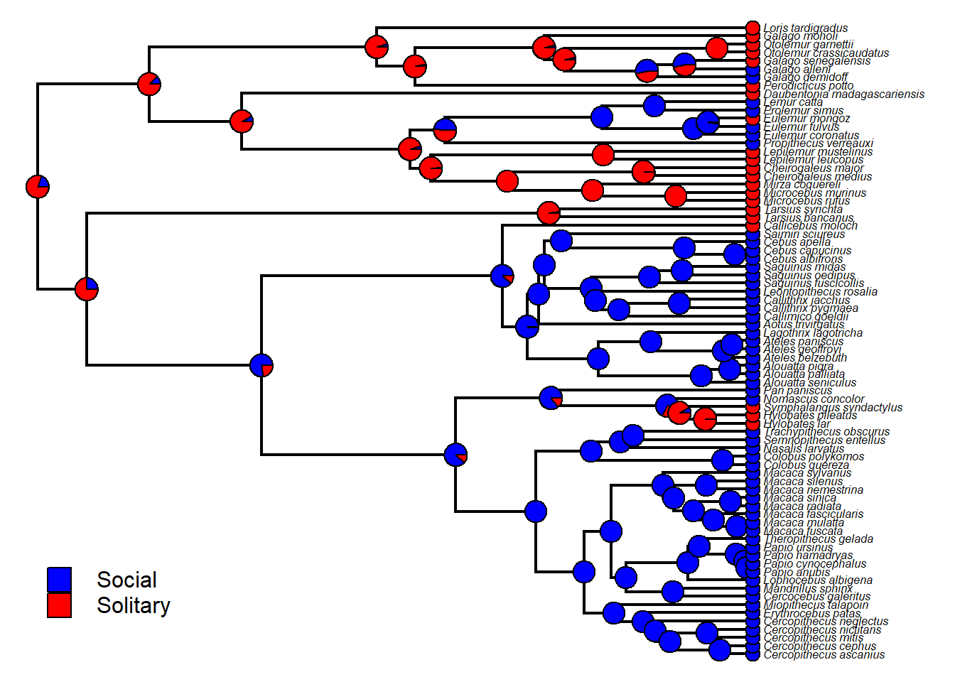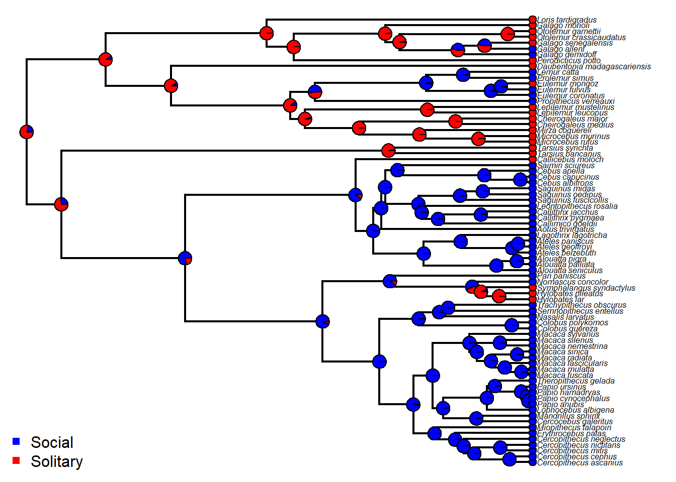 tiplabels(pie=to.matrix(binsocial[tree$tip.label],levels(binsocial)),piecol=cores,cex=0.3)