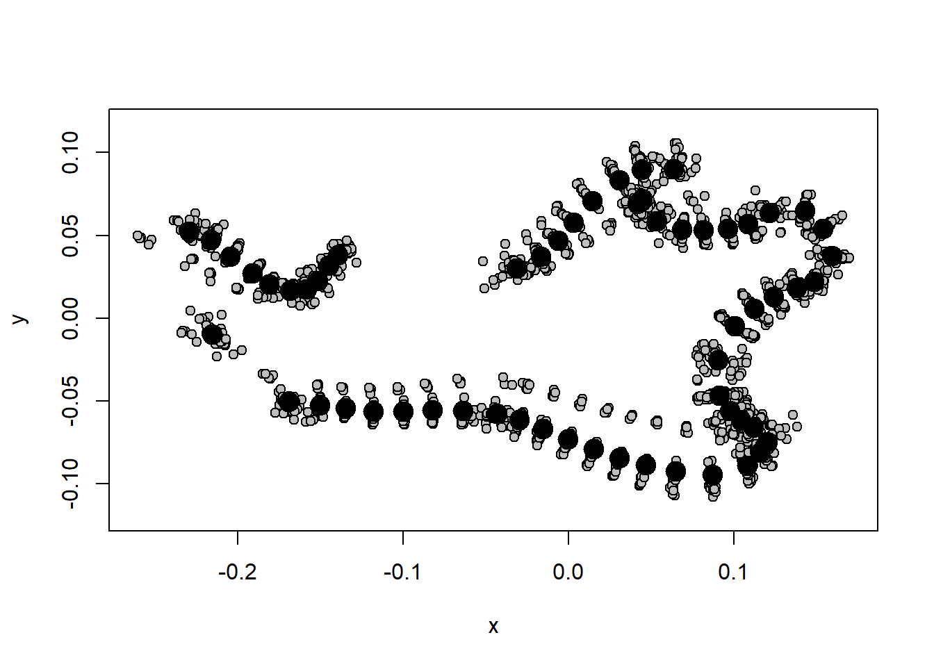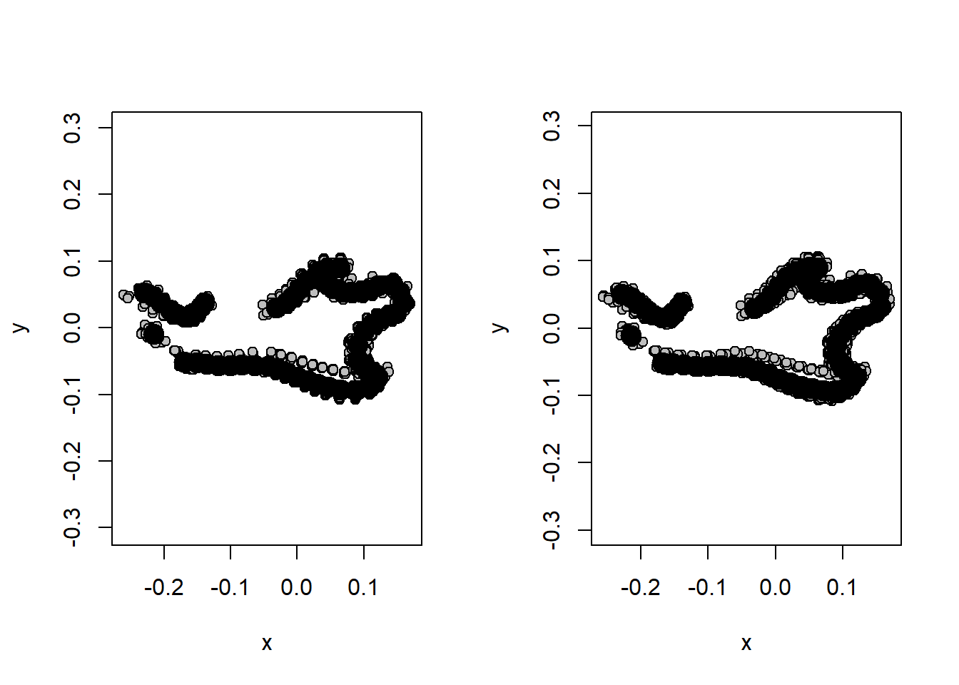 Agora podemos realizar uma análise de Procrustes deslizando os semilandmarks. A opção/argumento “ProcD=FALSE” vai deslizar os semilandmarks minimizando a energia de deformação, e a opção/argumento “ProcD=TRUE” vai deslizar os semilandmarks minizando as distâncias de Procrustes.