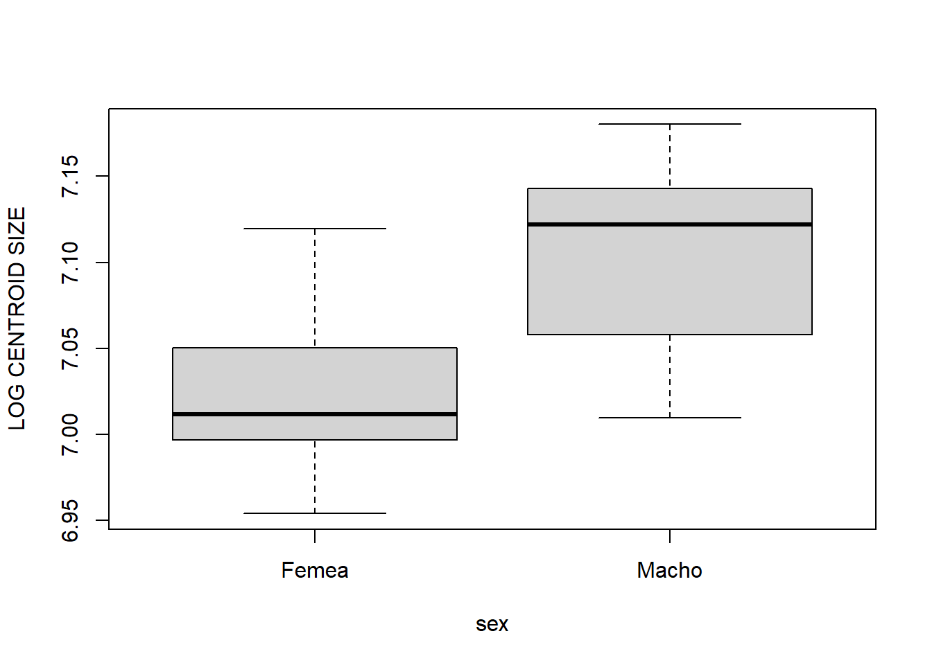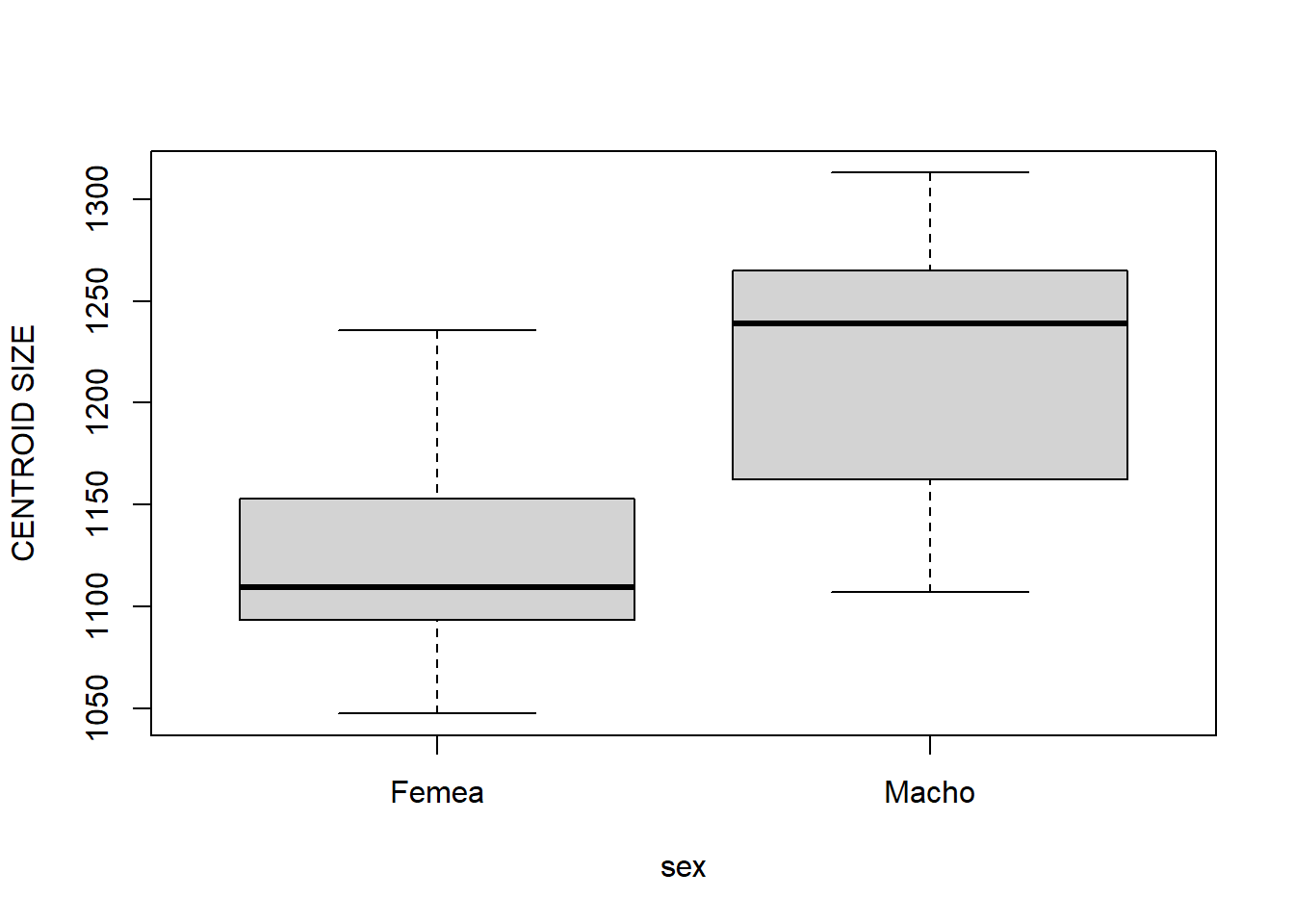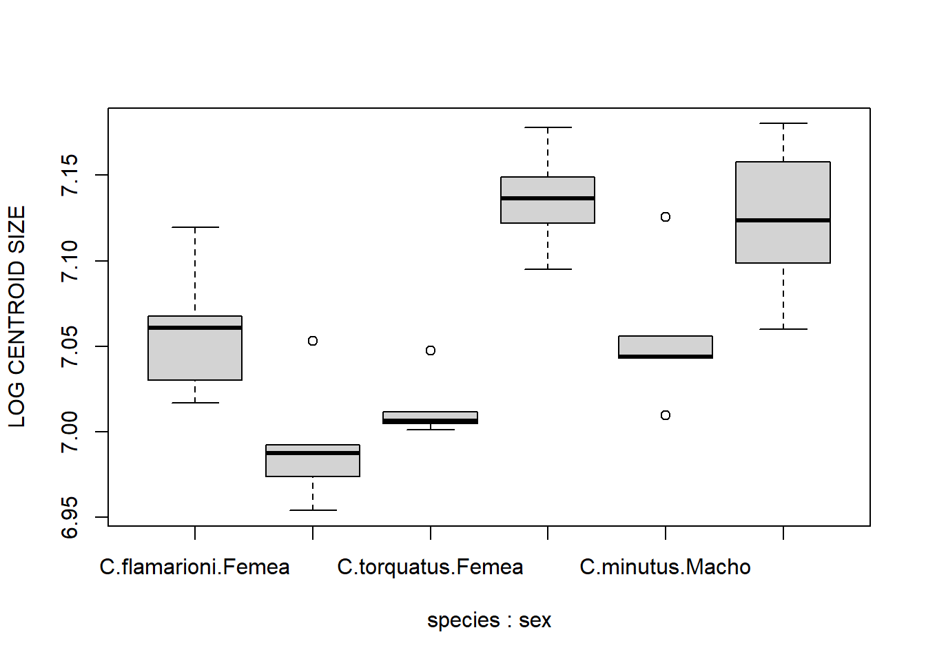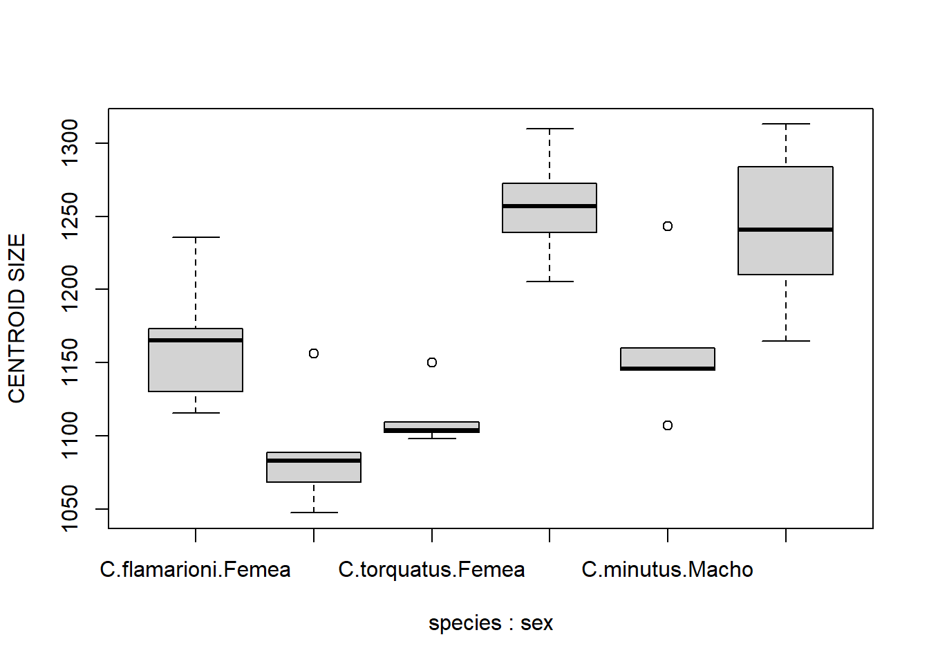 boxplot(size~species*sex,ylab="CENTROID SIZE")