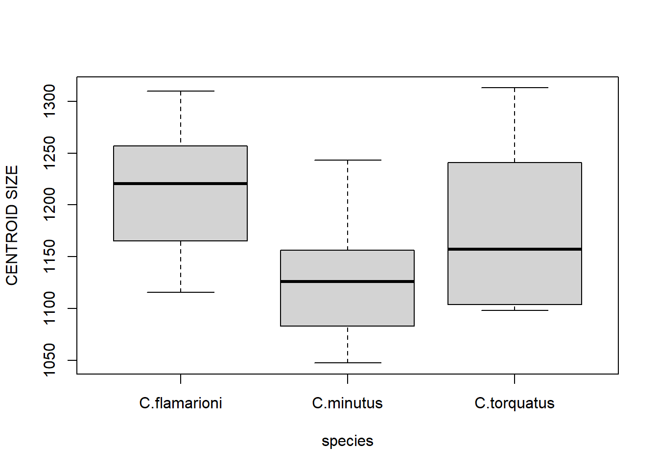 boxplot(size~species,ylab="CENTROID SIZE")