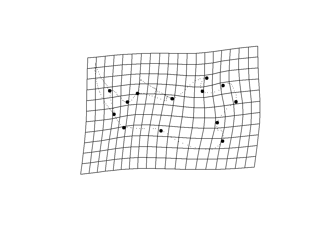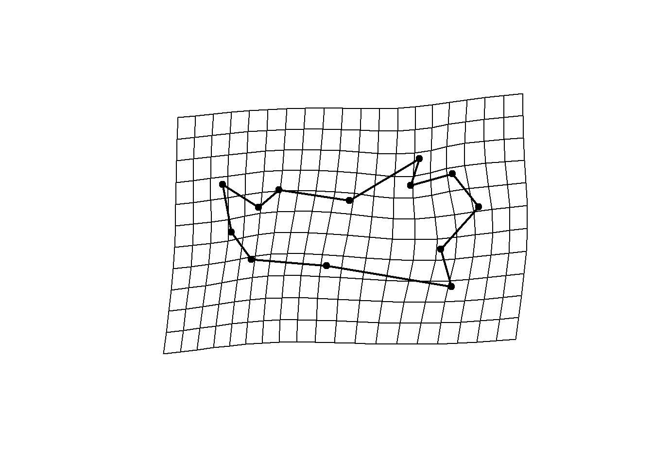 plotRefToTarget(ref.y,Y.gpa$coords[,,39], gridPars=GP4, mag=3, outline=plethodon$outline, method="TPS")